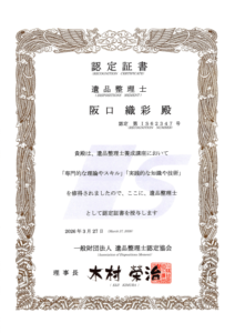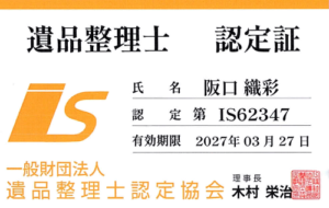 弊社女性スタッフが2026年3月27日に遺品整理士養成講座において「専門的な理論やスキル」「実践的な知識や技術」を修得し、一般財団法人遺品整理士認定協会に「遺品整理士」として認定されたことをお知らせいたします。